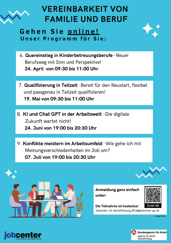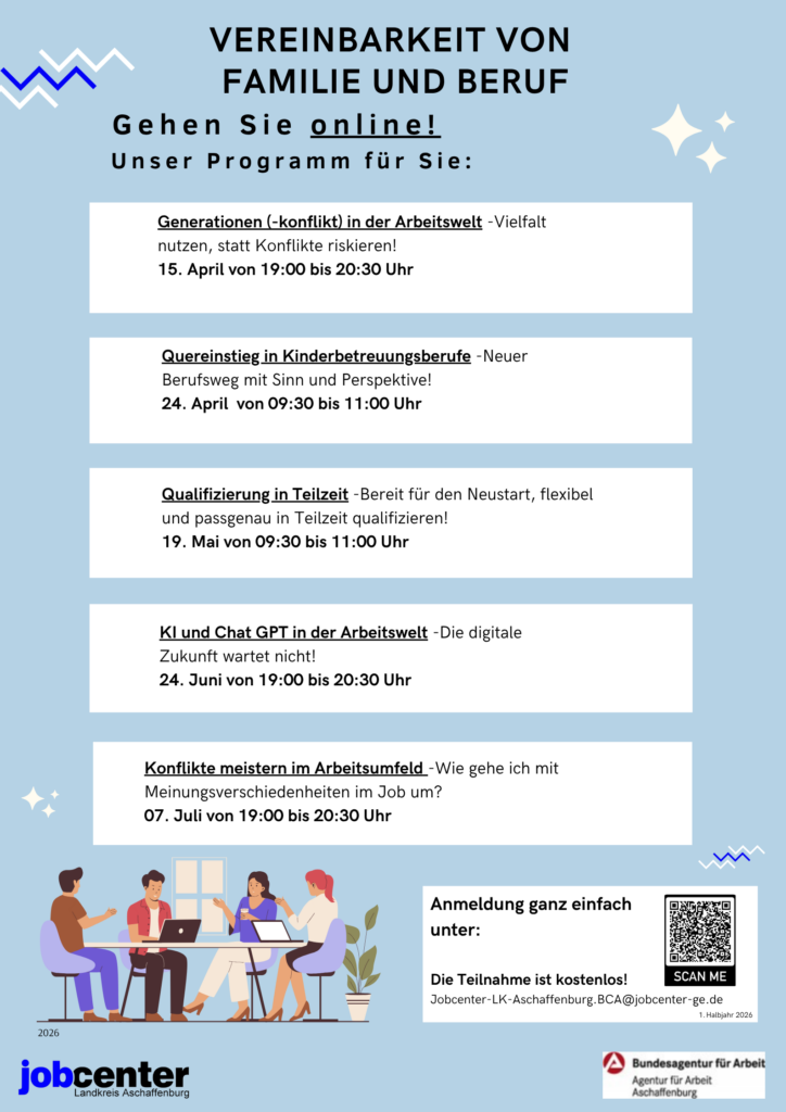Vereinbarkeit von Familie und Beruf Ich freue mich auf Sie!Silke JacobBeauftragte für Chancengleichheit am Arbeitsmarkt (BCA)Tel.: 06021 /390-166Lange Straße 1763741 AschaffenburgAnmeldung unter:Jobcenter-LK-Aschaffenburg.BCA@jobcenter-ge.de